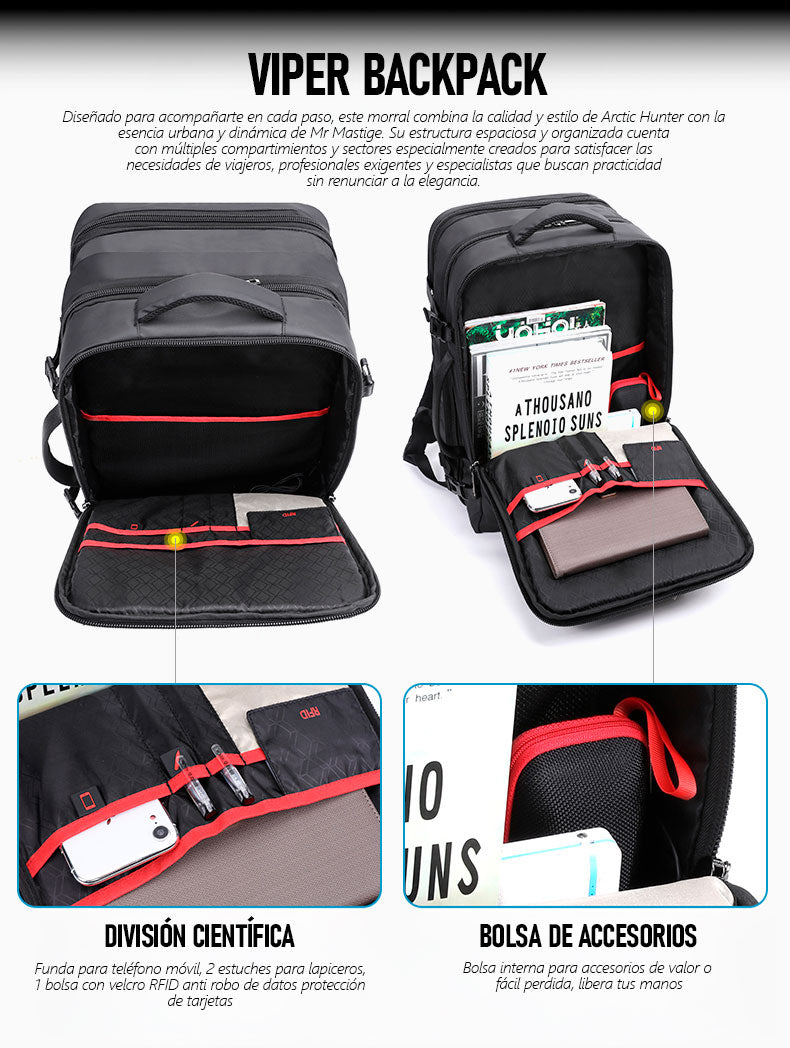 El morral multifuncional Viper x Arctic Hunter combina estilo, funcionalidad y seguridad, convirtiéndola en una opción ideal para profesionales y viajeros. A continuación, se detallan sus principales características:
