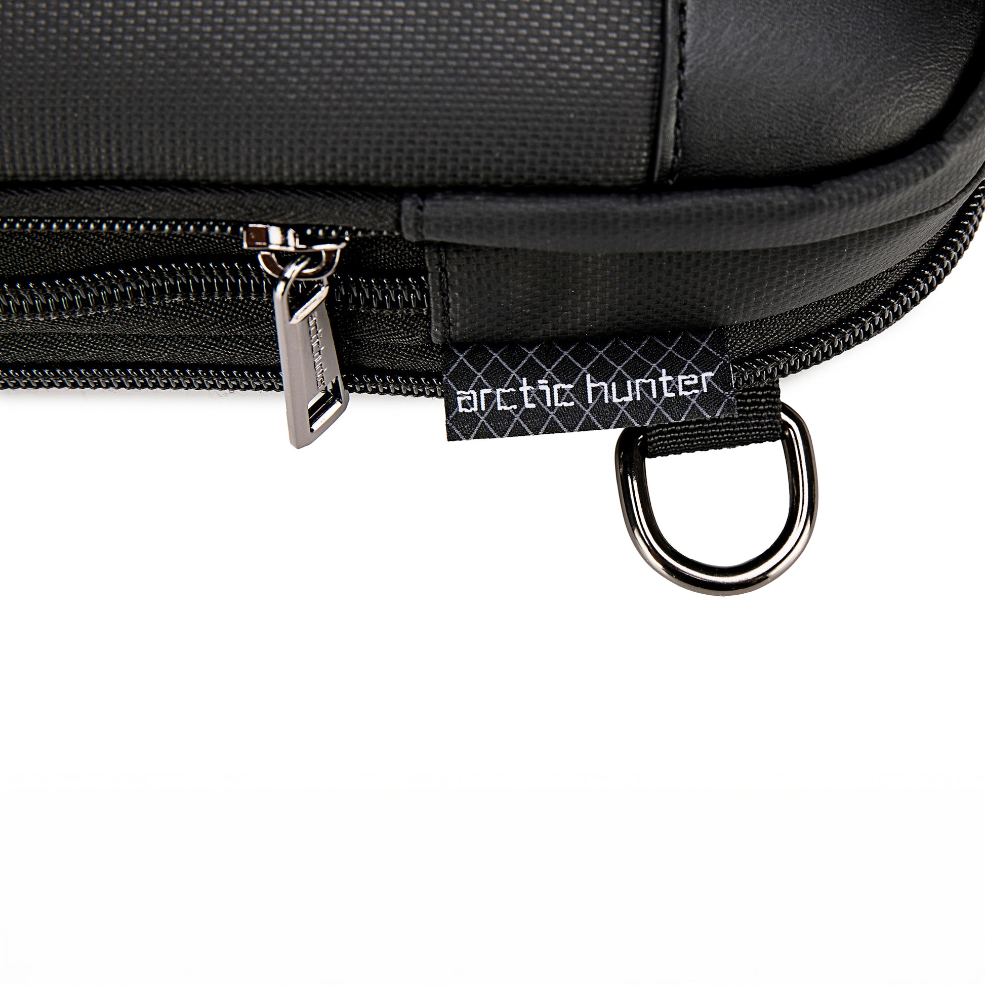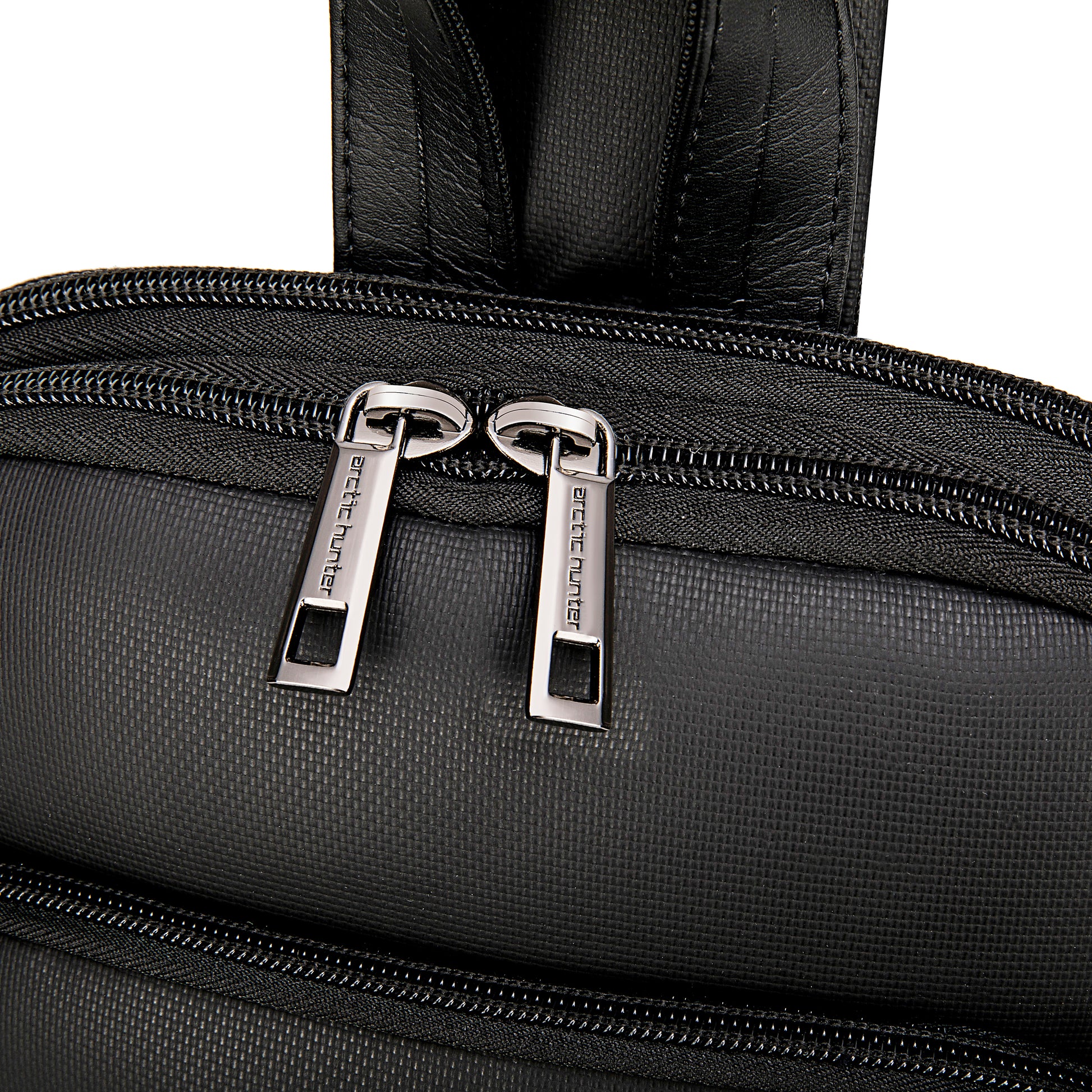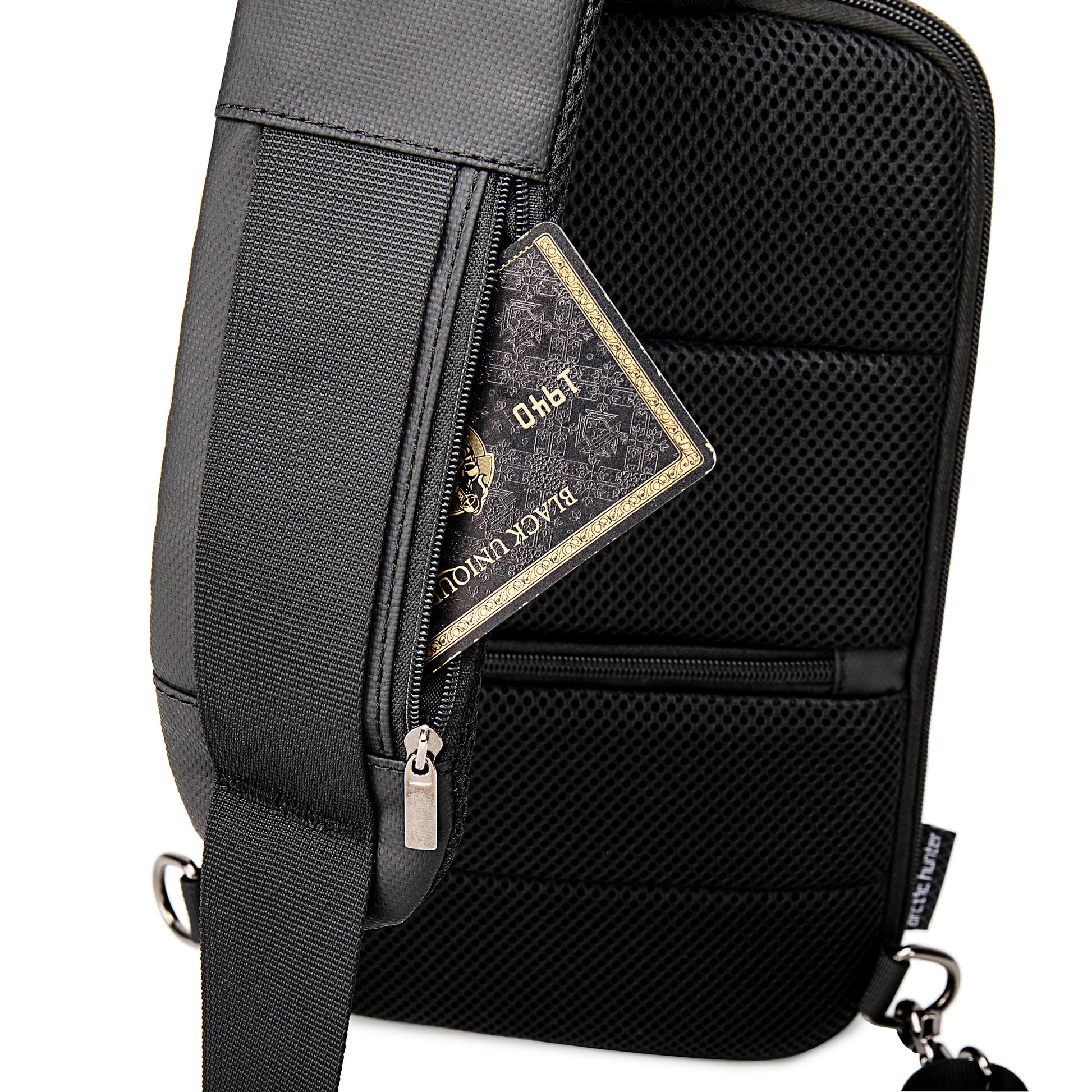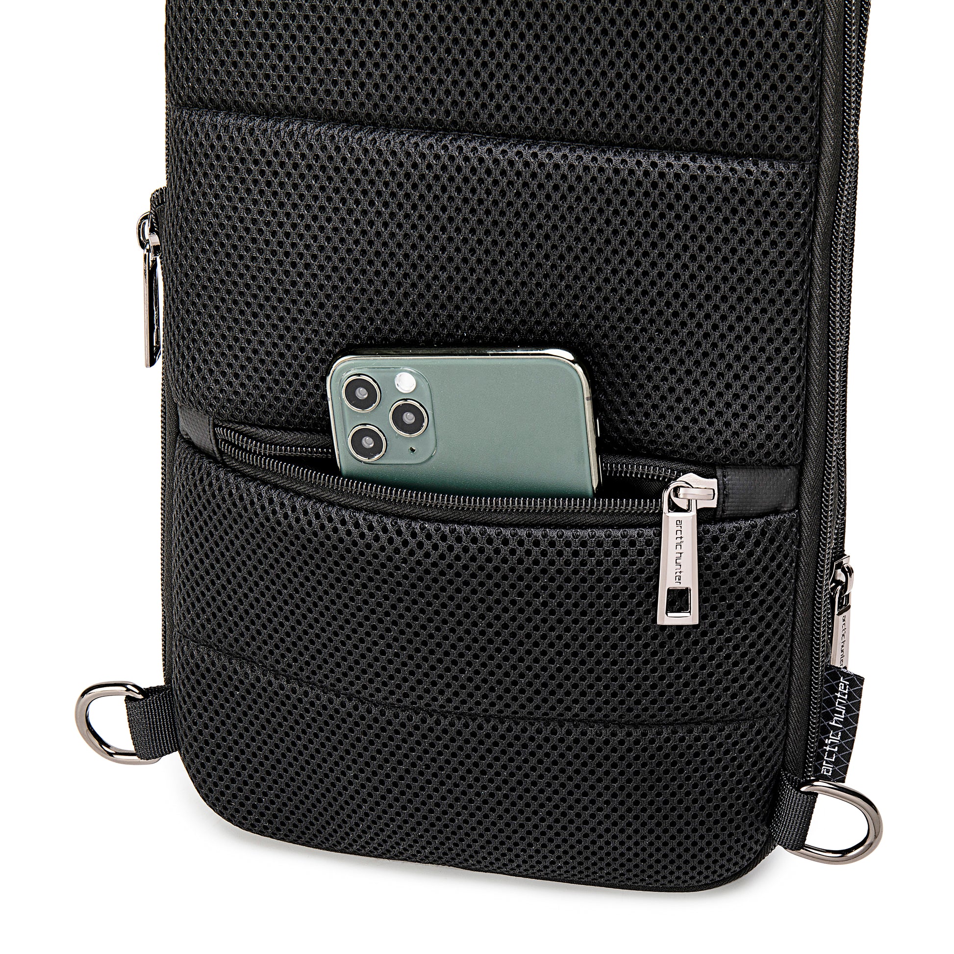 - Organización inteligente: Cuenta con múltiples bolsillos: bolsillo principal con cremallera, bolsillo frontal de acceso rápido, bolsillo trasero antirrobo y bolsillo para tarjetas integrado en la correa del hombro.
